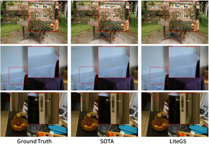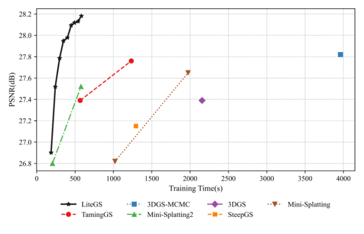 在相同参数量下,LiteGS在PSNR指标上超出主流方案0.2–0.4dB,训练时间缩短3.8至7倍。